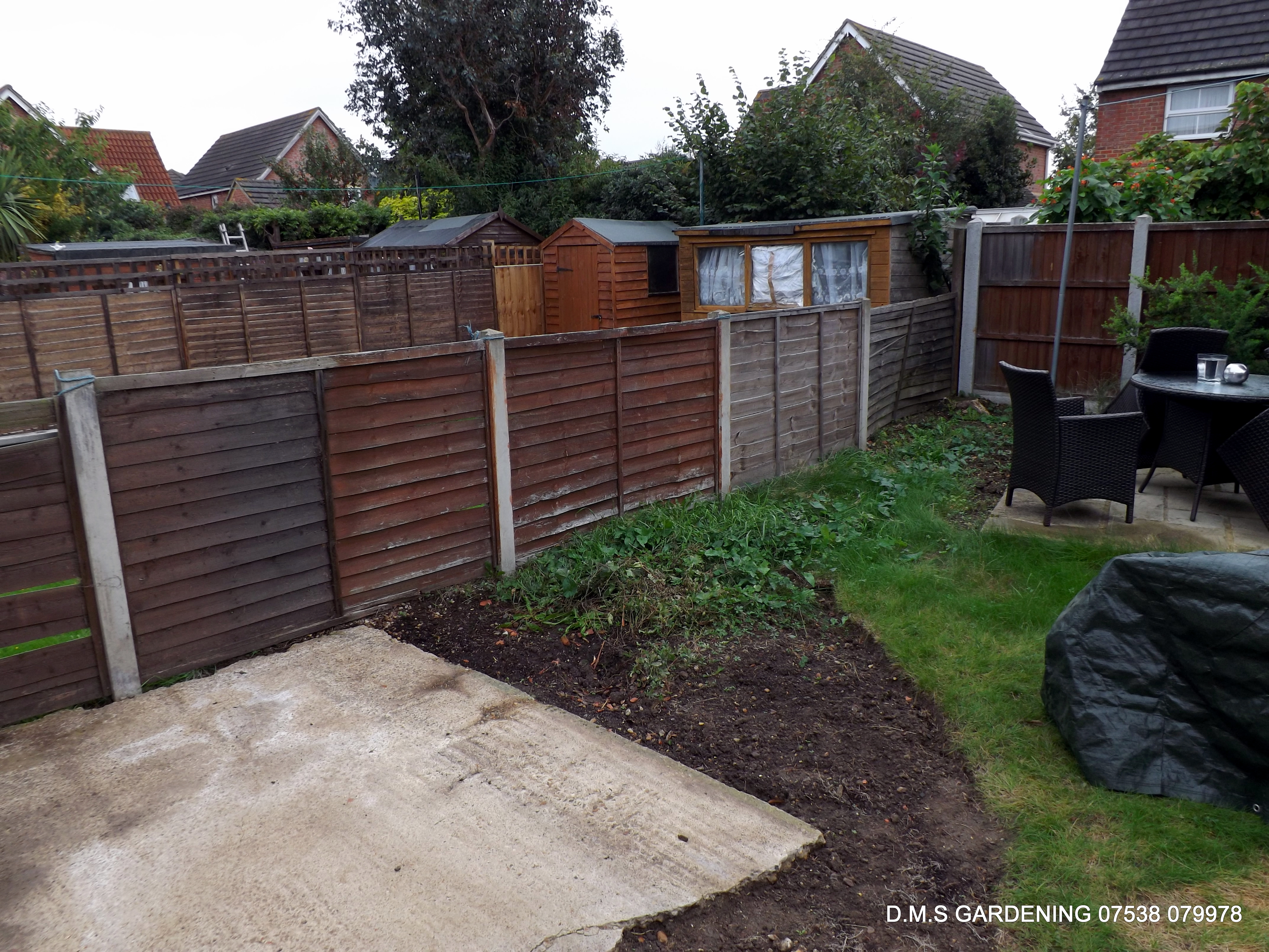 Low fence to be replaced with a 6ft one. Tree stump in corner to be removed.
